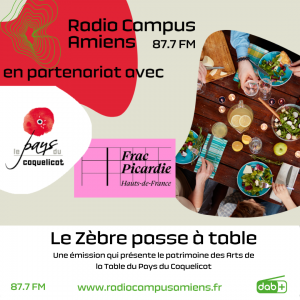 Dans le cadre d’un partenariat entre le FRAC, la com de com du Pays du Coquelicot et Radio Campus Amiens. Les membres du conseil citoyen d’Albert ont choisi de monter une émission de radio intitulée “Le Zèbre passe à table”. L’idée est de vous présenter le patrimoine des Arts de la Table du Pays du Coquelicot.