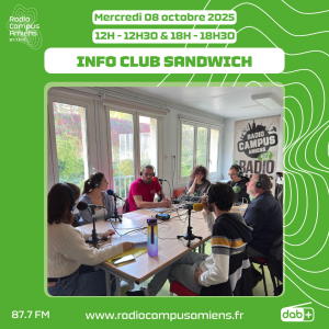 Dans l’Info Club Sandwich du jour, nous vous proposons une émission spéciale puisque l’équipe était en direct du centre social Elbeuf Lescouvé à l’occasion de la fête de la science avec une table ronde : “L’accès à la science pour toustes”. Nos invités du jour sont Emmanuel Niquet (animateur scientifique à la ville d’Amiens), Simon Cartigny (directeur adjoint de Planète Sciences), Quentin Sauvé (animateur à Acti-fep) et Yũna Le Gouëf (doctorante au laboratoire Edysan).
