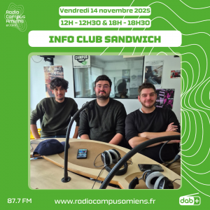 Aujourd’hui, nous nous retrouvons pour un Info Club Sandwich réalisé par Olivia, Sacha, Julien et Mattéo, étudiant.es de l’UPJV incrist.es dans l’atelier journalisme. Dans cette émission, nous écoutons William Tessier, chargé de communication du ciné st-Leu et Alexandre Levaray, directeur artistique du FIFAM, qui nous parlent du Festival International du Film d’Amiens 2025 dans une interview réalisée par Mattéo. Le FIFAM commence aujourd’hui et continuera jusqu’à 22 novembre 2025. Par ailleurs, l’émission spéciale à l’occasion “On Débobine“, en partenariat avec les chroniqueurs de Parlons Ciné, reprends dès lundi 17 et ce, jusqu’à vendredi 21 novembre.