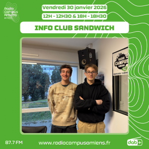 En seconde partie d’émission, Coline vous parle des actualités : elle commence avec un atelier Do It Yourself : Fabriquer des objets en plastique recyclé. C’est organisé par Amiens Métropole dans le cadre de la labellisation “territoire engage dans la transition écologique”. Ça se passe samedi 31 janvier de 10h à 12h. Elle continue en vous parlant d’un club pour enfant : micro-disco organisé à Longueau le dimanche 1er février à partir de 15h. Pour terminer, le festival Feminist Futures a ouvert ses portes. Voici un petit topo de ce que vous attends ce week-end : samedi 21 janvier, 7 minutes (comité d’usine) est jouée par la compagnie du berger au centre culturel Jacques Tati à 16h, le dimanche 1er février, une série de conférences autour des violences sexistes et sexuelles est organisée à la maison de la culture. Il y aura aussi des séance de cinéma, des ateliers et même un salon du livre dès 10h. Vous pourrez suivre tout ce festival à travers l’émission quotidienne Fréquence(s) Féministe(s) juste après l’Info Club Sandwich, à 12h30 dès lundi.